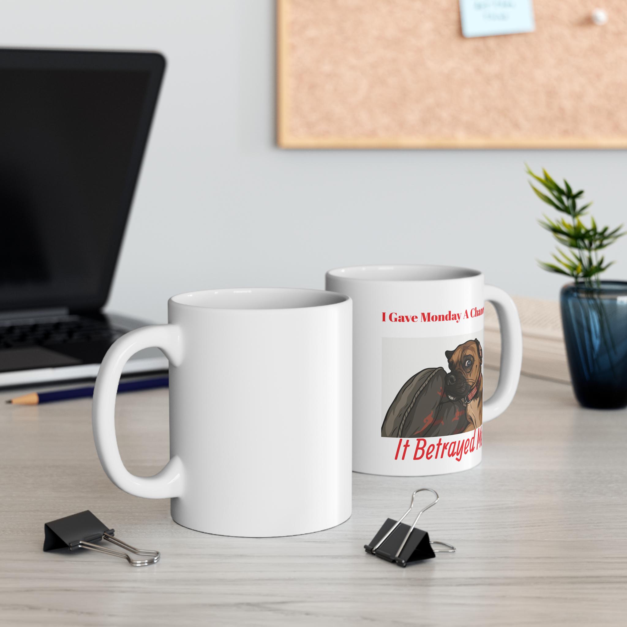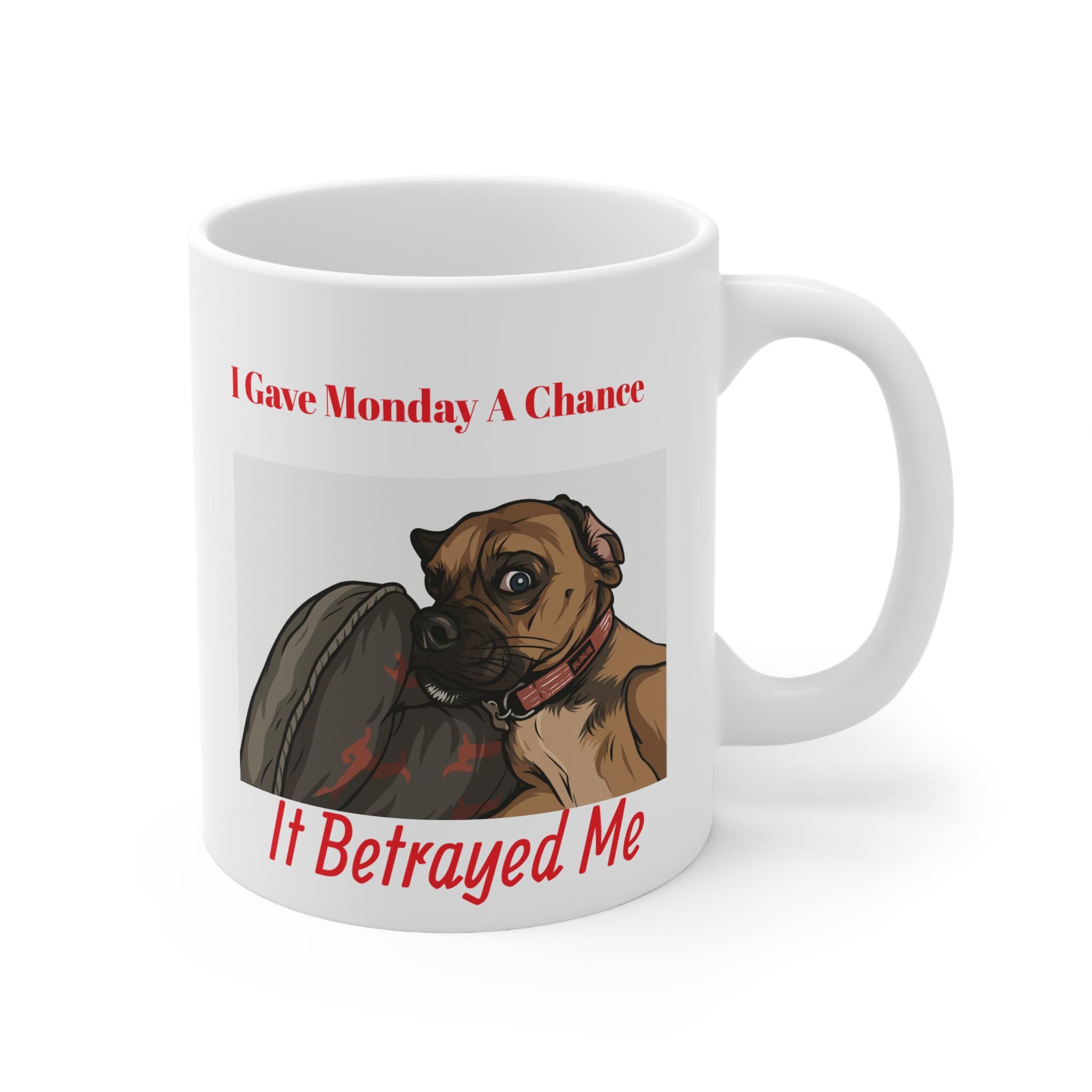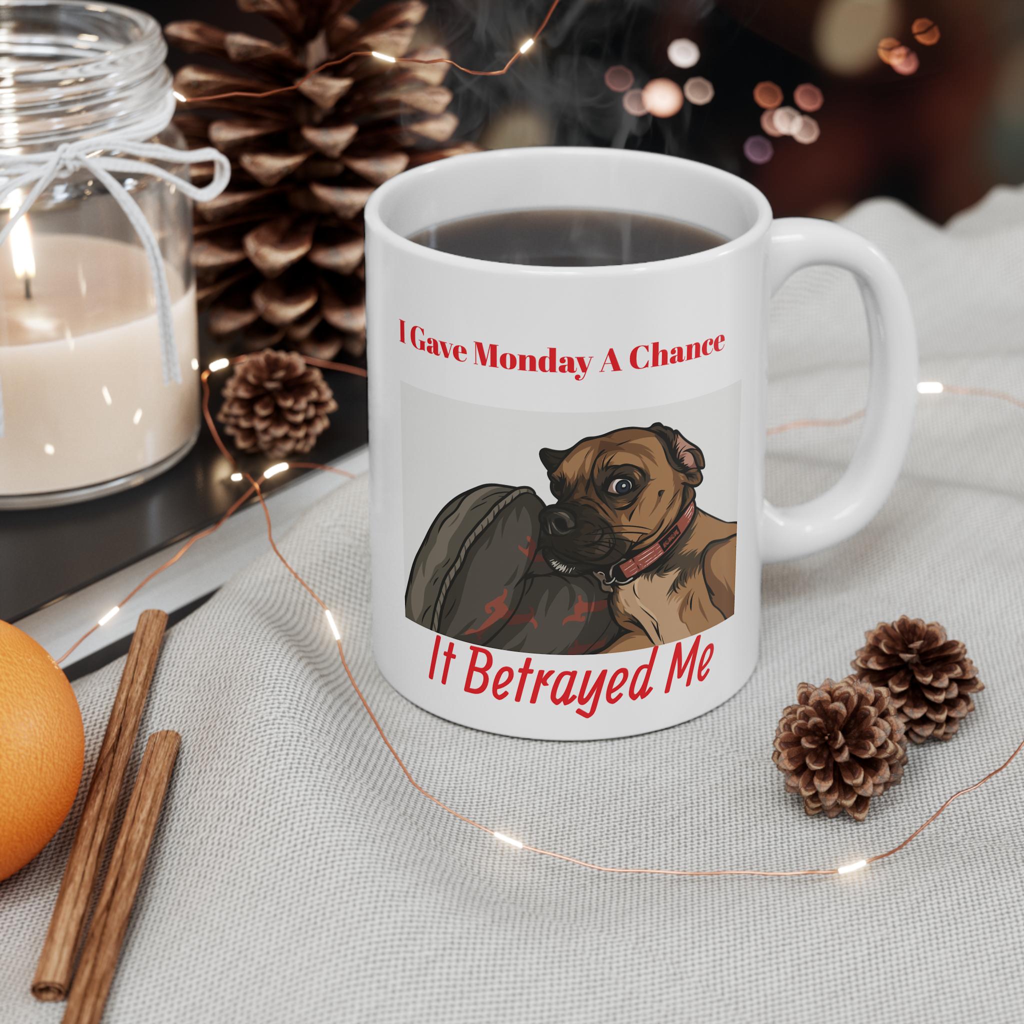 Mondays are rough — and this mug gets it. Featuring a hilariously defeated pup and the bold red caption “I Gave Monday A Chance / It Betrayed Me”, this ceramic coffee mug is the ultimate mood for anyone who’s ever regretted setting that alarm. Whether you're fueling up for work or winding down after a betrayal by the calendar, this mug delivers comfort with a side of sass.