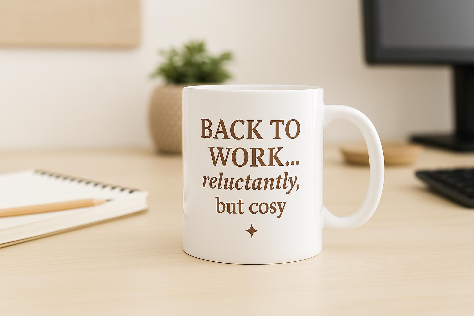 This “Back to Work… reluctantly, but cosy” design is made for soft starts, slow mornings, and reluctant returns to routine — all with a warm drink in hand.
