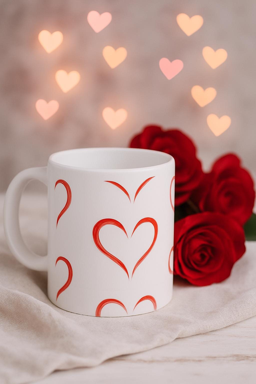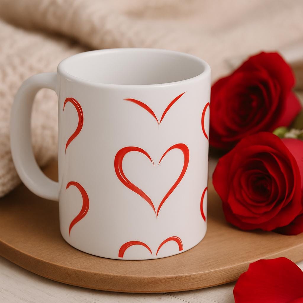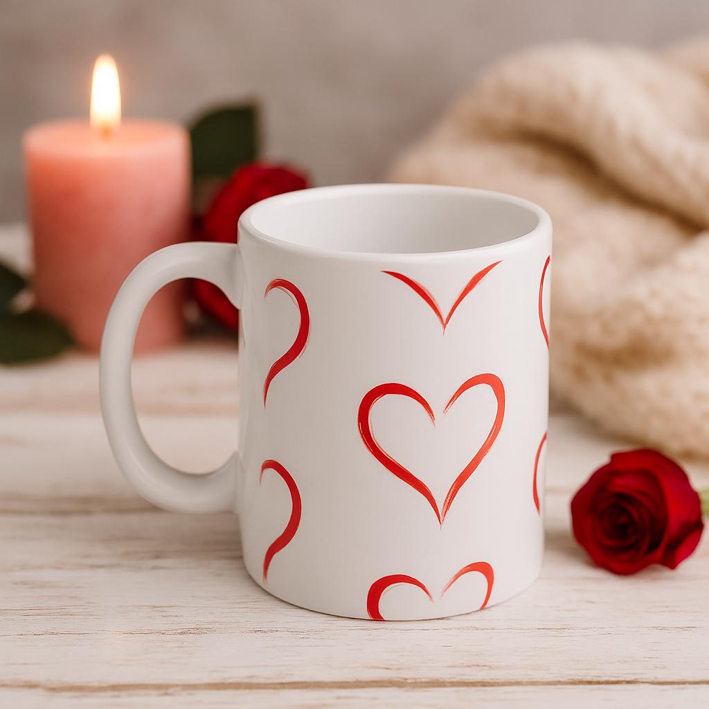 Wrap your hands around a little moment of love. This charming white ceramic mug is adorned with a repeating pattern of hand‑drawn red hearts, creating a soft, romantic feel that’s perfect for Valentine’s Day, anniversaries, or cosy mornings with someone special.