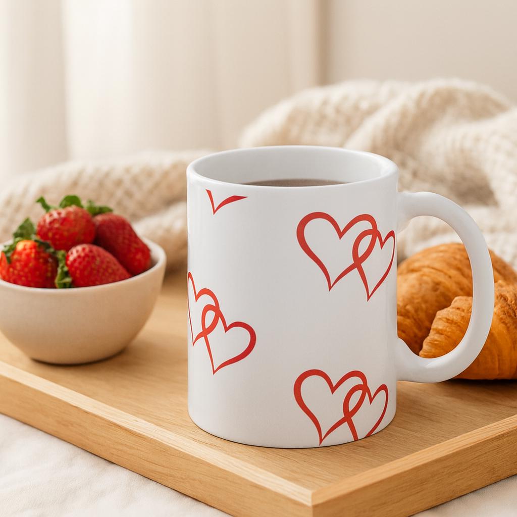 This white ceramic mug is wrapped in a cascade of intertwined red hearts — a bold, romantic pattern that celebrates love in every sip. Whether it’s for Valentine’s Day, an anniversary, or a cosy morning with someone special, this mug brings warmth and affection to your daily brew.