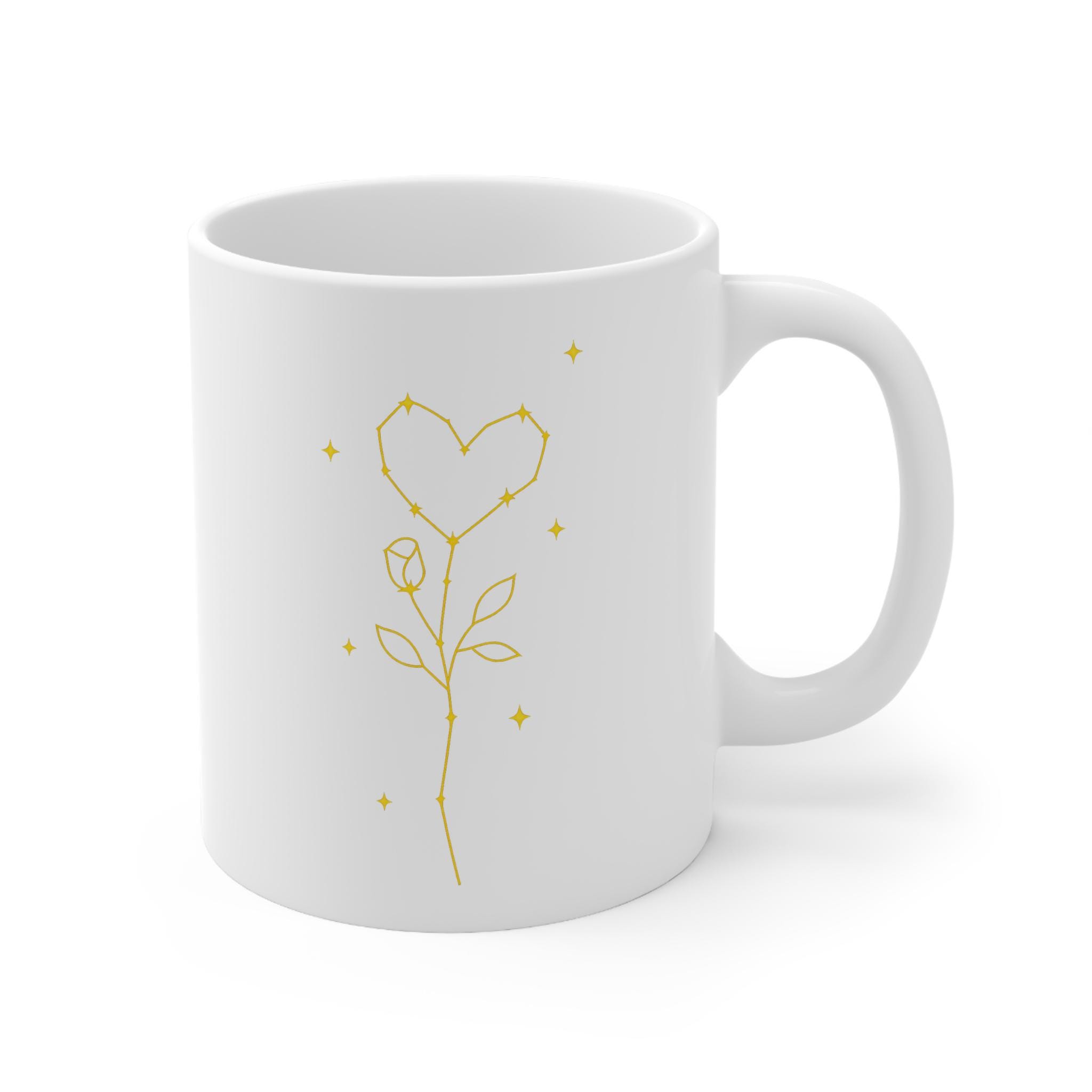 Celebrate a love that’s written in the stars with this romantic ceramic mug featuring the heartfelt quote: “Our Love Blooms Among The Stars.”