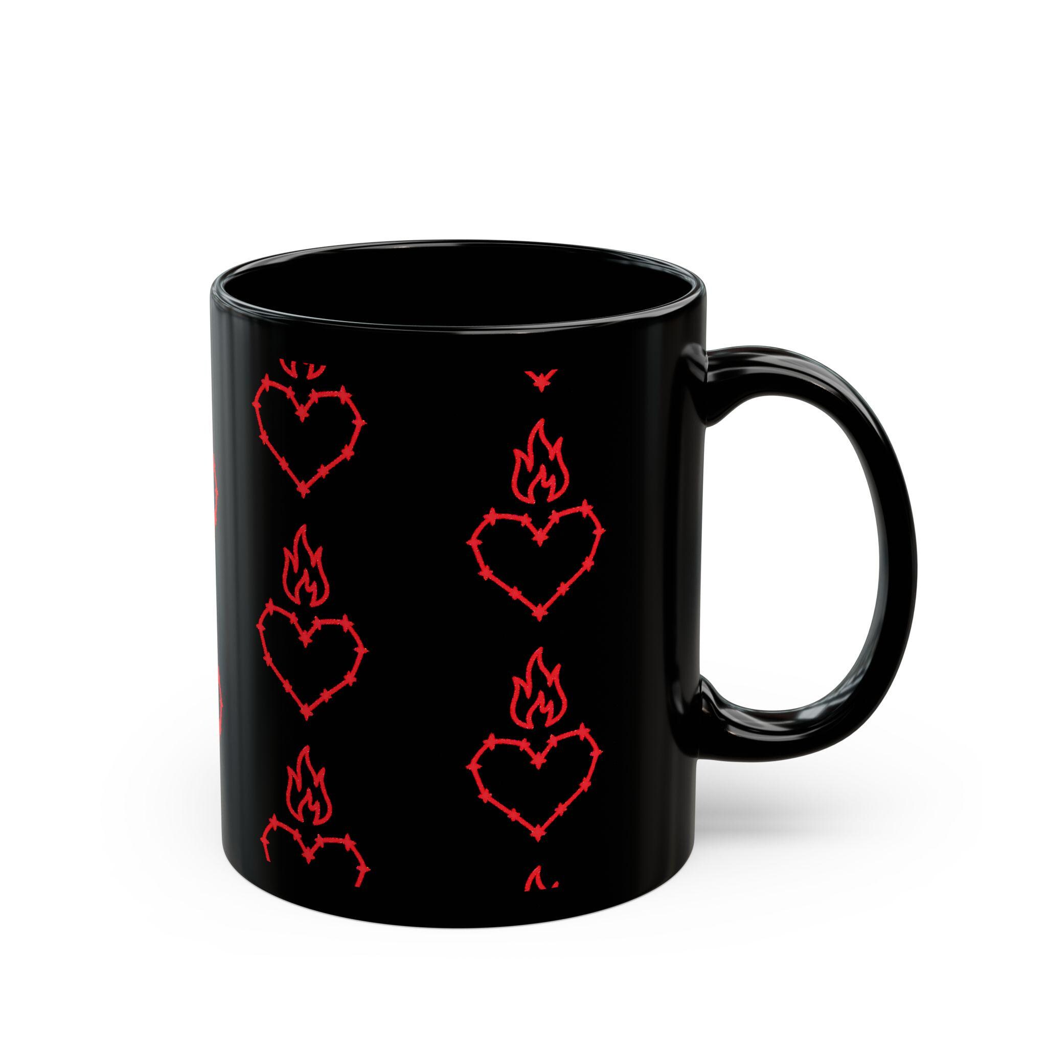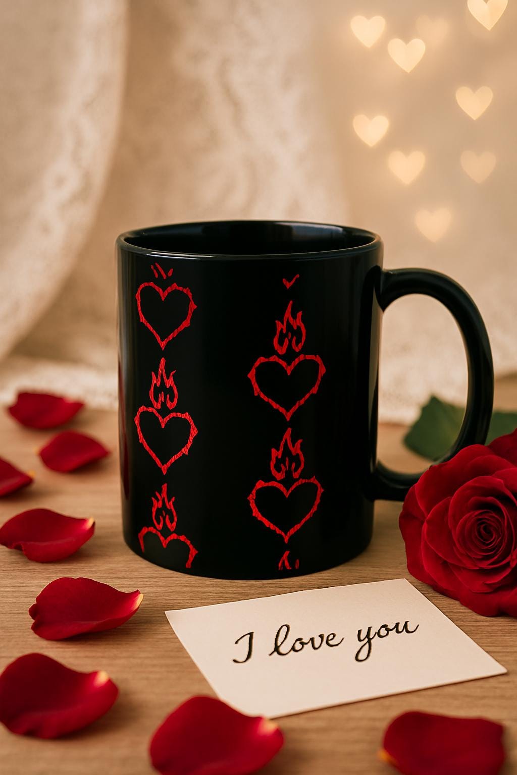 Ignite your mornings with this bold ceramic mug featuring a striking pattern of red flame-tipped hearts wrapped in thorny outlines. Set against a sleek black background, each heart radiates intensity and passion—perfect for lovers of expressive, gothic, or alternative aesthetics. Whether you're sipping coffee or gifting a fiery token of affection, this mug makes a statement. Ideal for Valentine’s Day, romantic rebels, or anyone who loves a little edge with their brew.