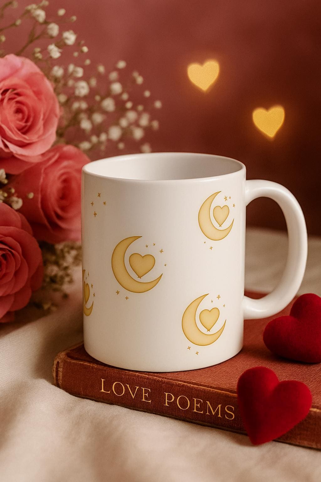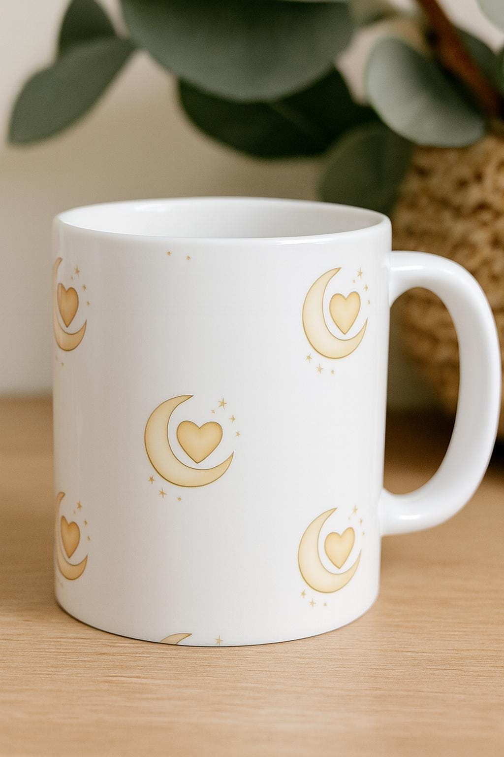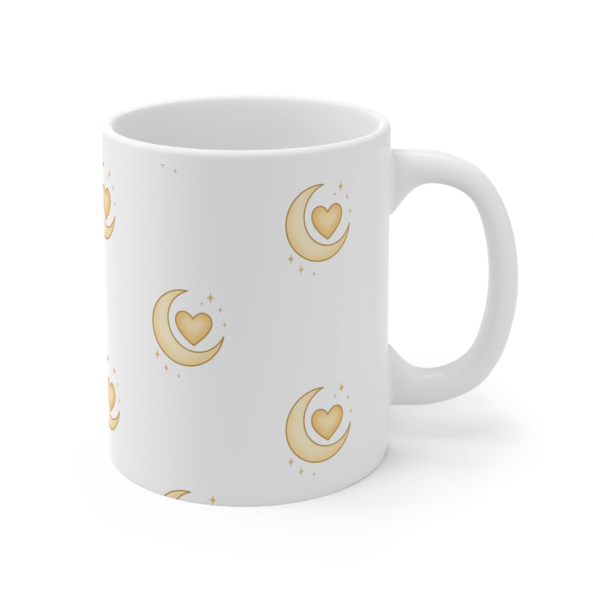 Sip in style with this romantic celestial mug featuring a golden crescent moon cradling a heart, surrounded by soft sparkles. Perfect for Valentine’s Day, self-love rituals, or cozy evenings under the stars. The whimsical design adds boutique charm to your morning brew or evening tea. A thoughtful gift for moon lovers, dreamers, and anyone who adores a touch of magic in their daily routine.