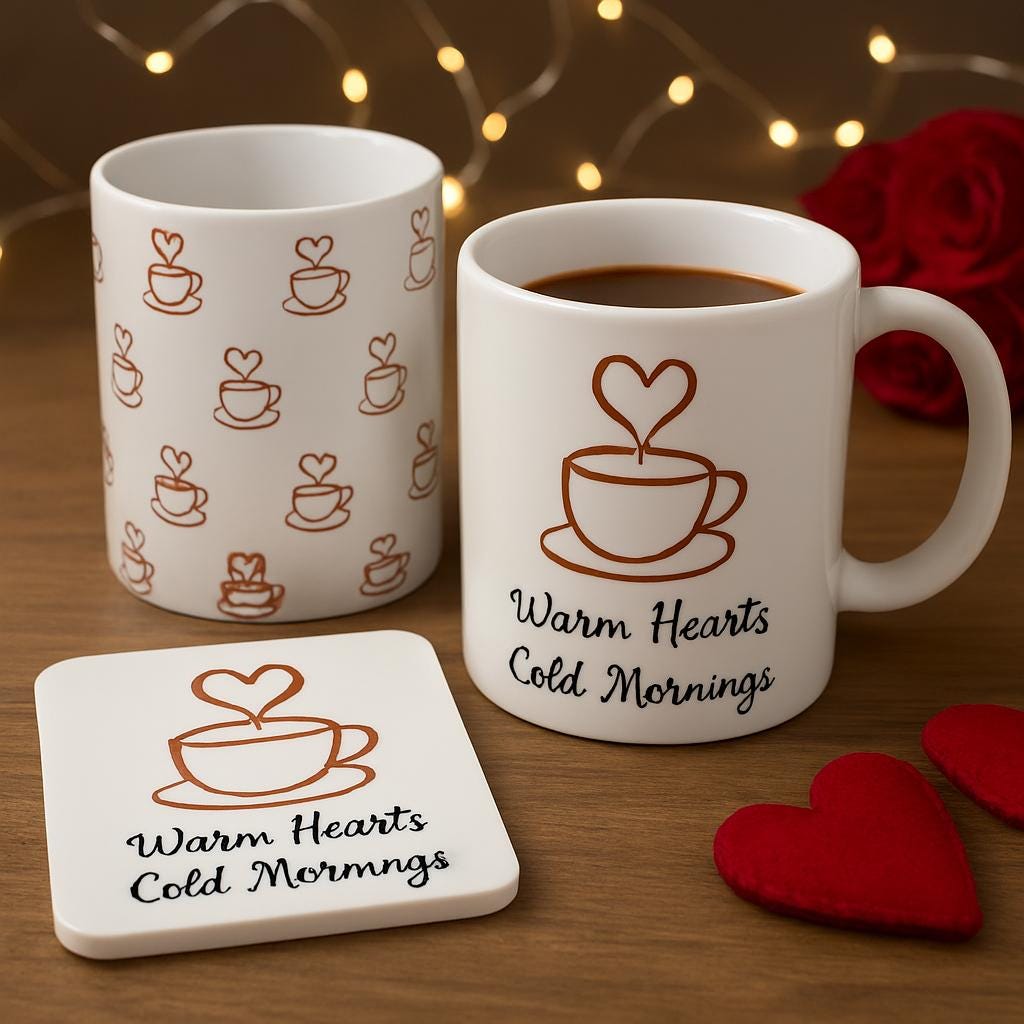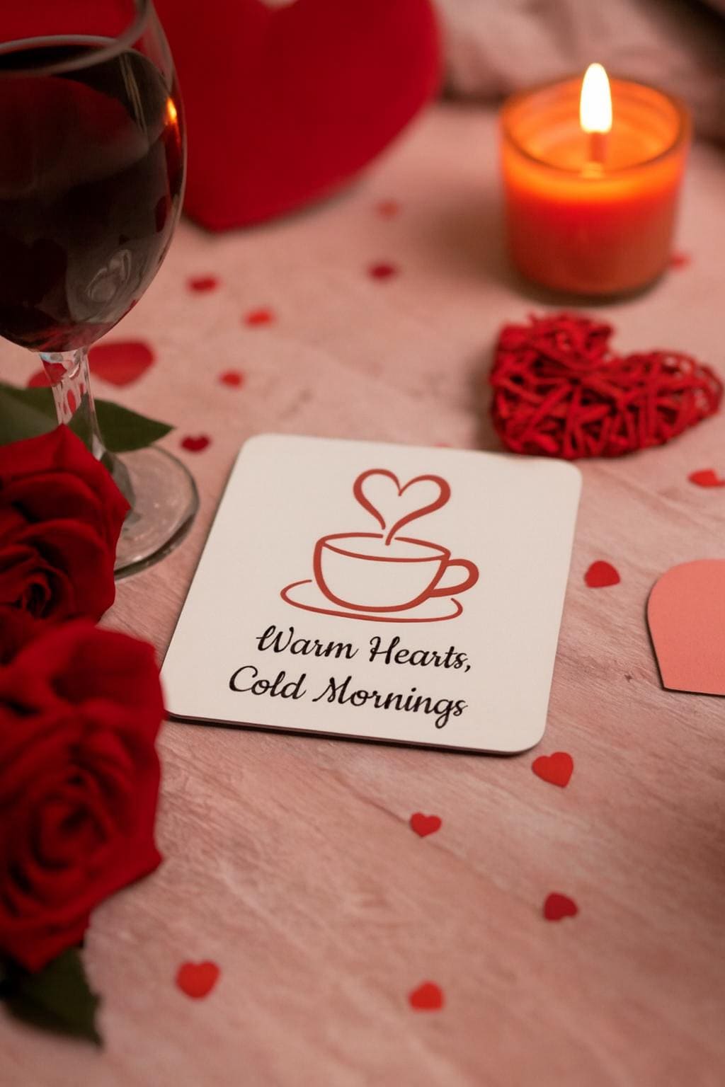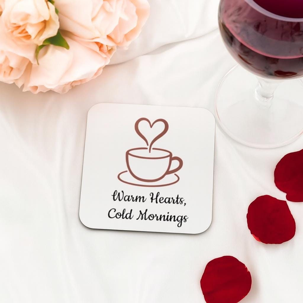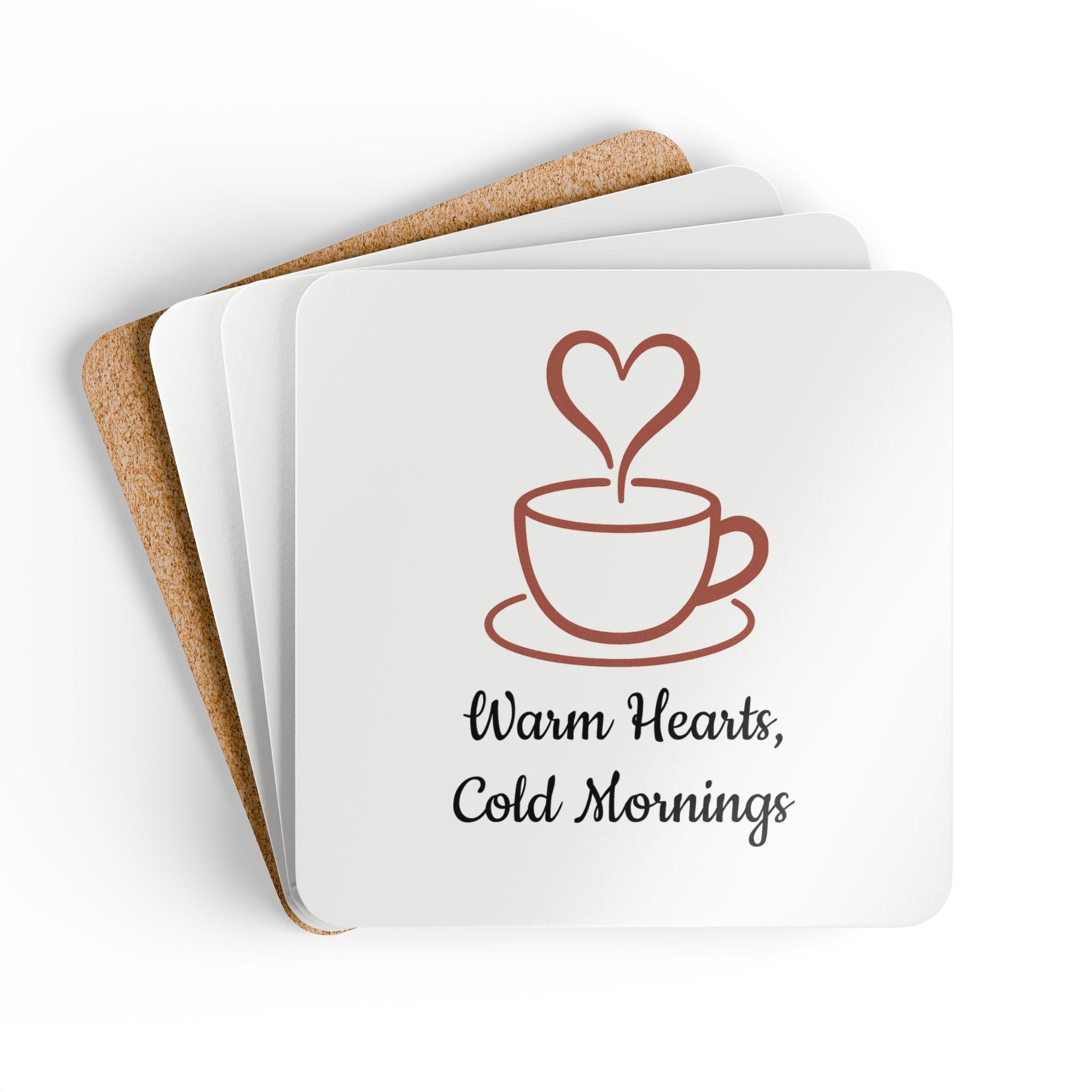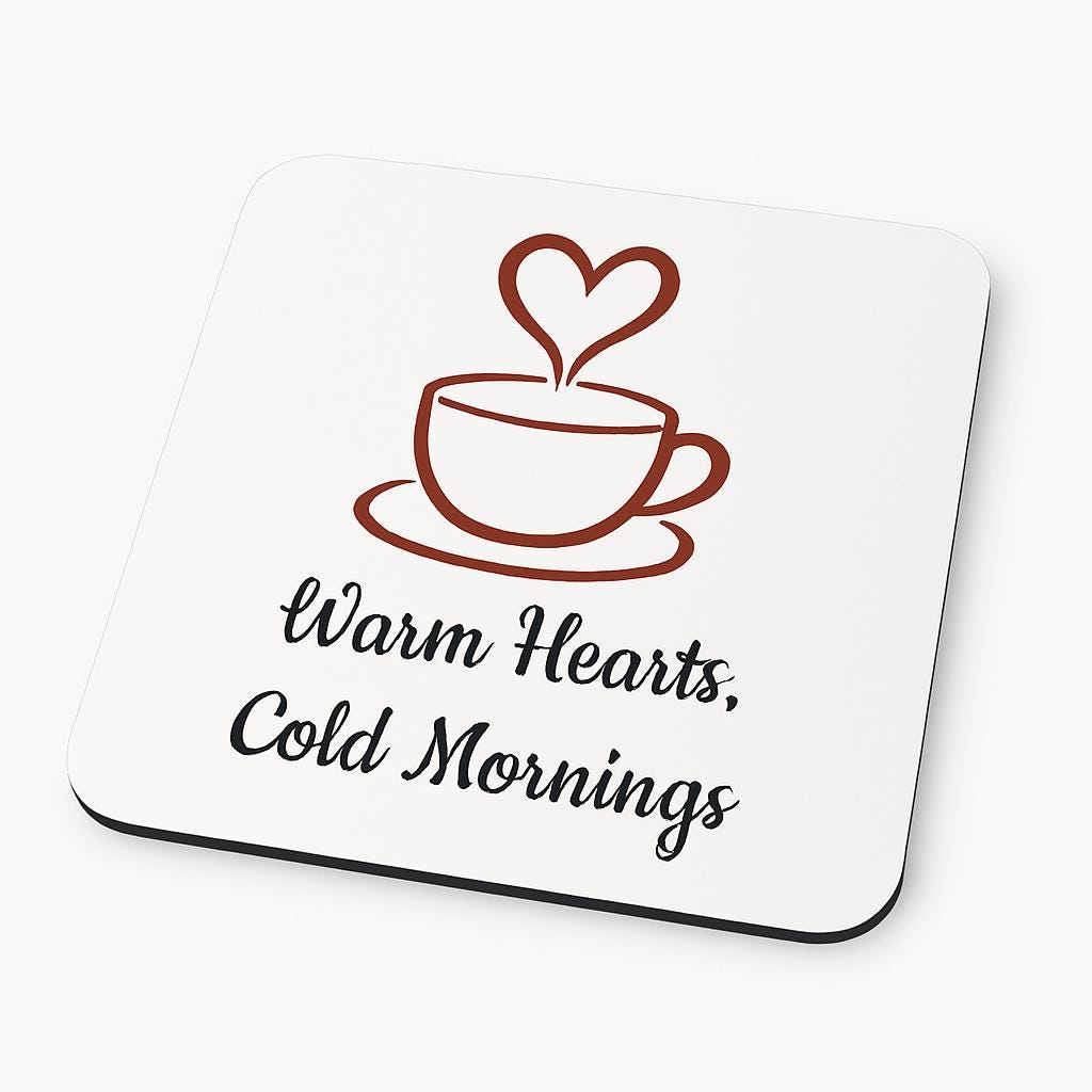 Start your day with warmth and charm. This cork coaster features a cozy coffee cup illustration with heart-shaped steam and the phrase “Warm Hearts, Cold Mornings” — perfect for chilly mornings and heartfelt moments.