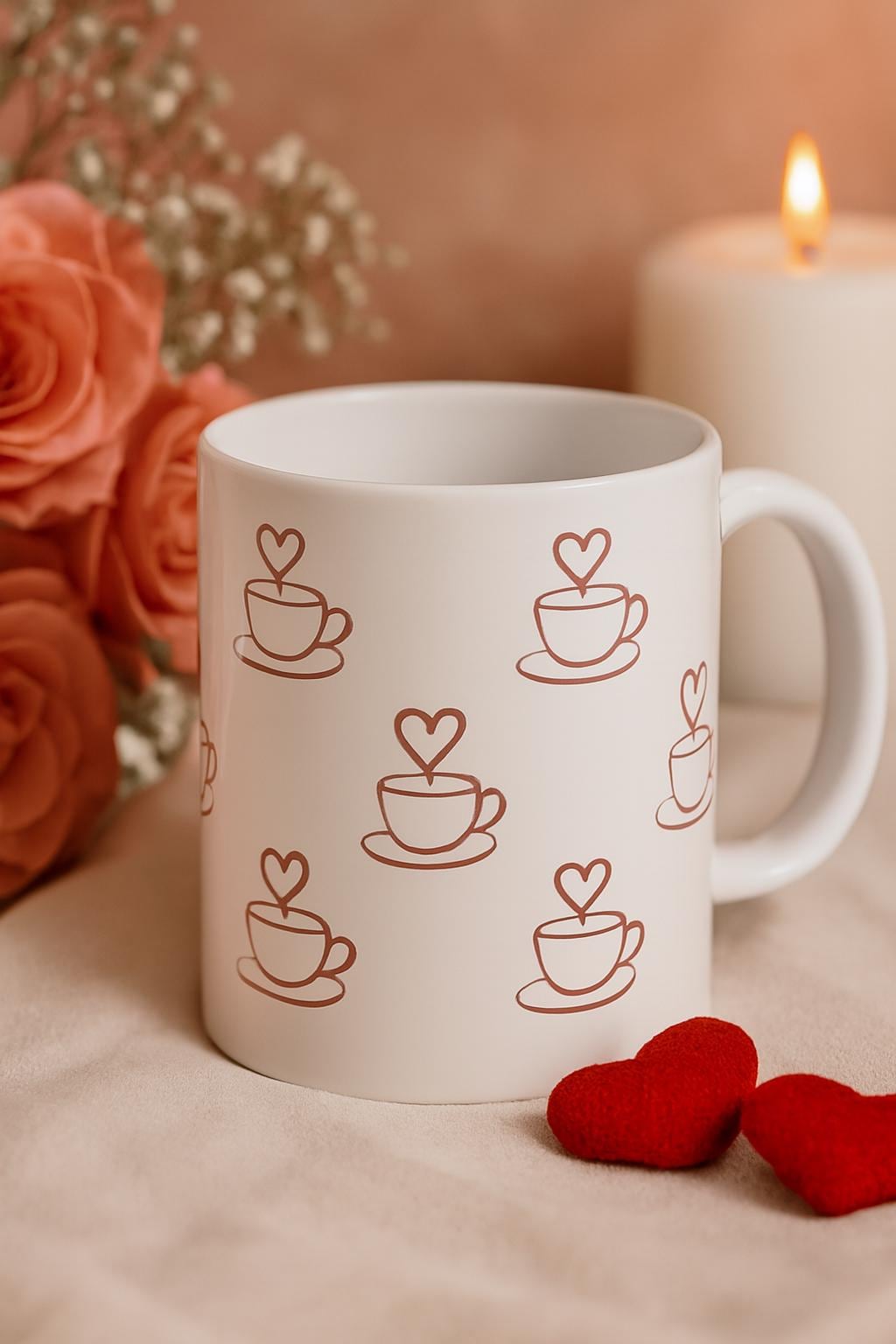 Start your day with a little love. This charming ceramic mug features a repeating pattern of coffee cups with heart-shaped steam in a warm reddish-brown tone — perfect for cozy mornings, thoughtful gifting, or your daily brew ritual. A boutique-style essential for coffee lovers and romantic souls alike.