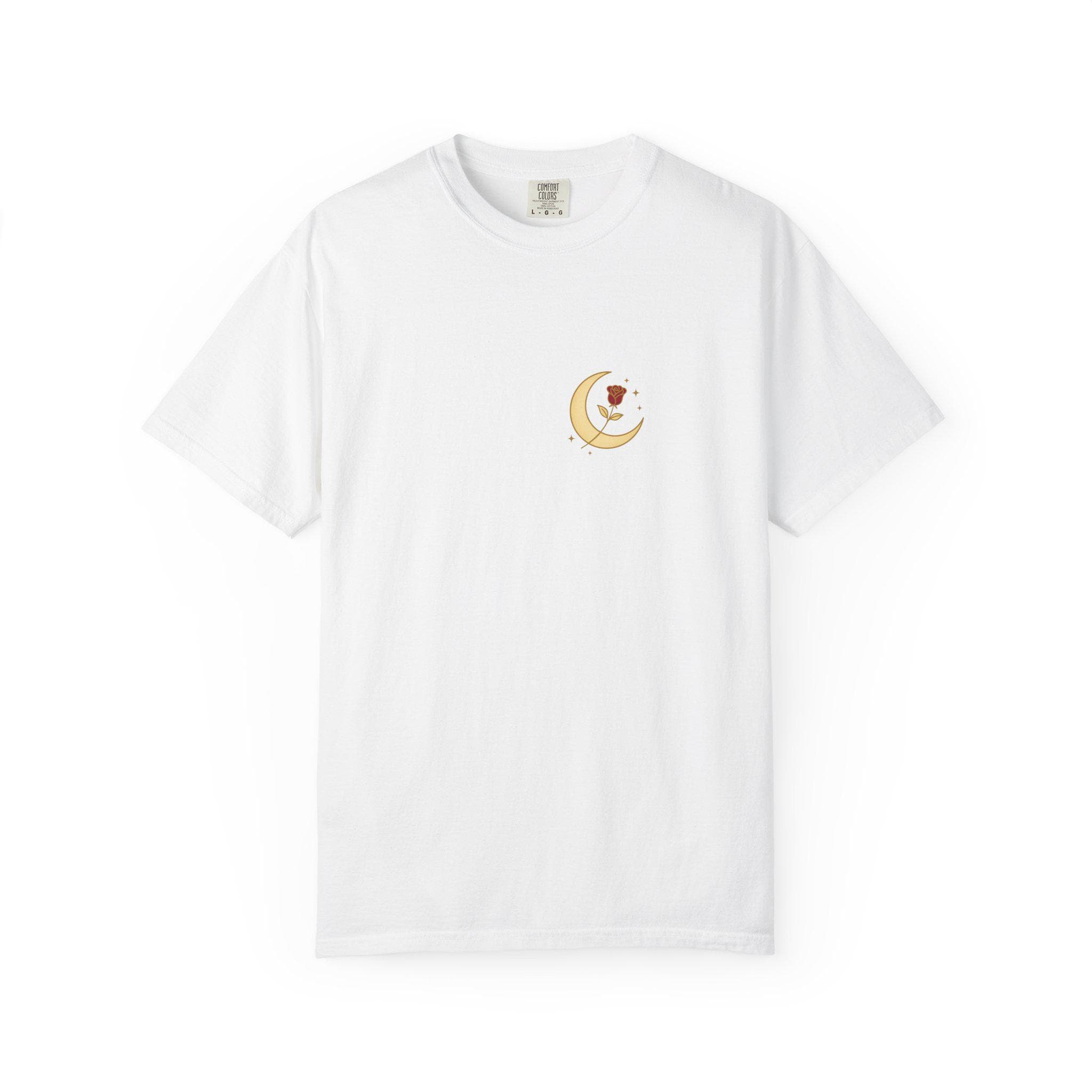 A soft, garment-dyed tee that feels lived-in from the first wear. This relaxed-fit shirt carries a small, whimsical chest print of a crescent moon cradling a tiny heart—quiet and gentle, like a private promise. The heavyweight cotton and tubular construction give it structure while the garment-dye process softens the fibers and adds a subtle vintage wash. Wear it on slow weekend mornings, layered under an open flannel for bonfire nights, or as a comforting companion for late-night walks. It speaks to people who prefer understated charm over loud statements—a shirt that slips into everyday life and becomes part of the story.