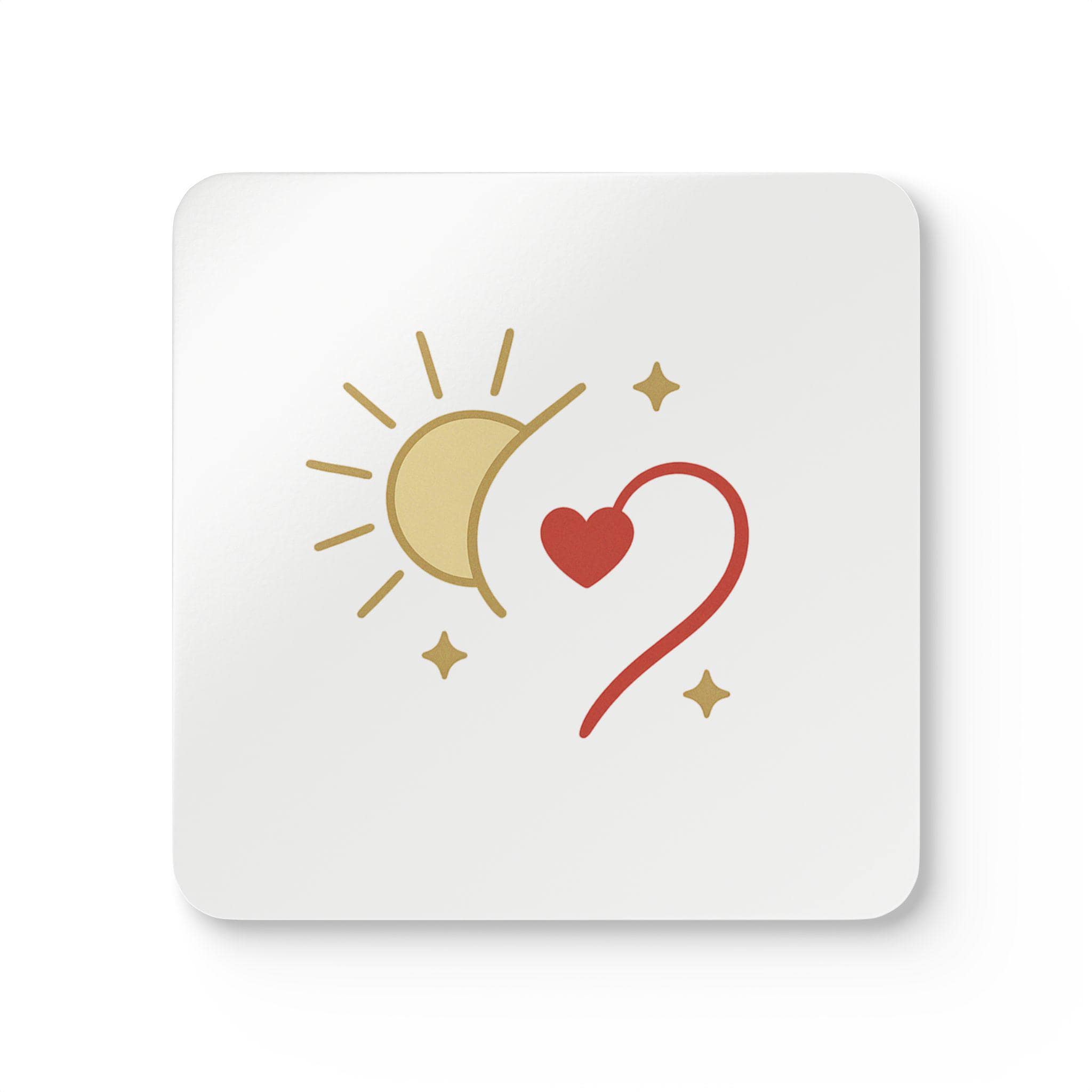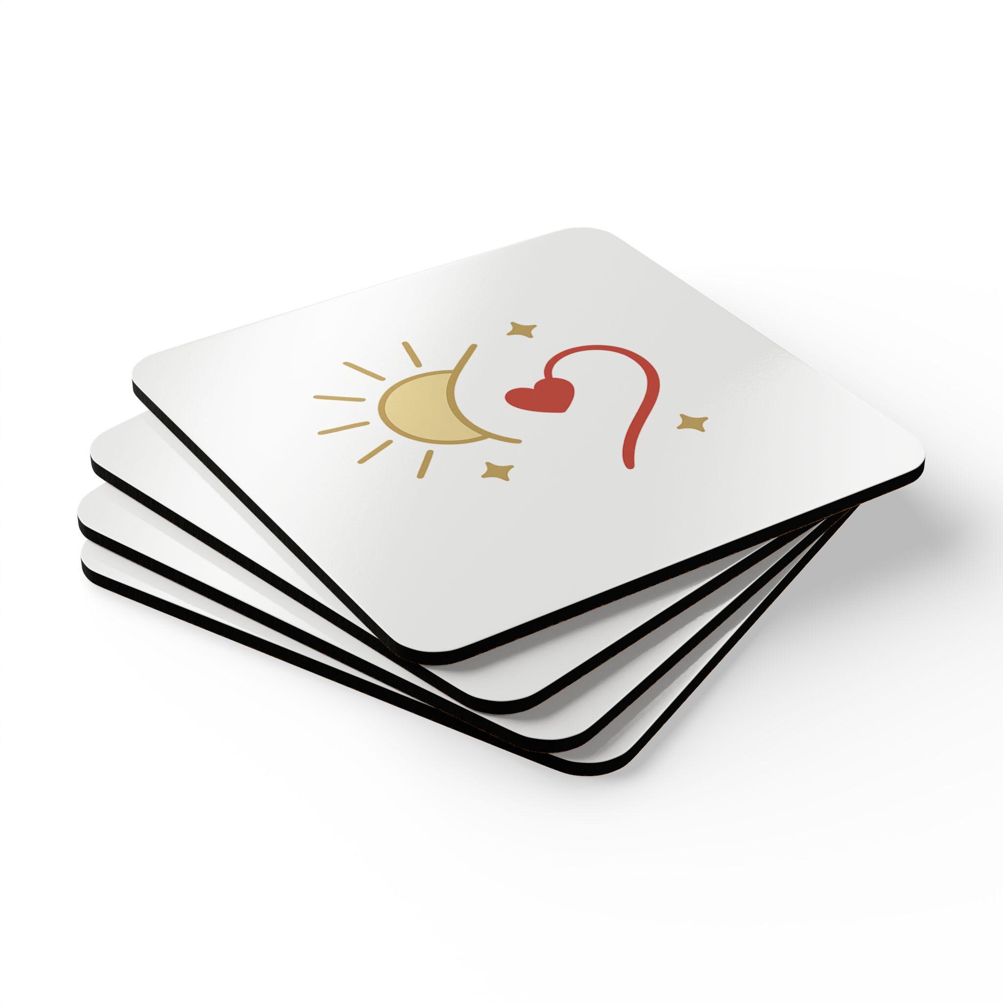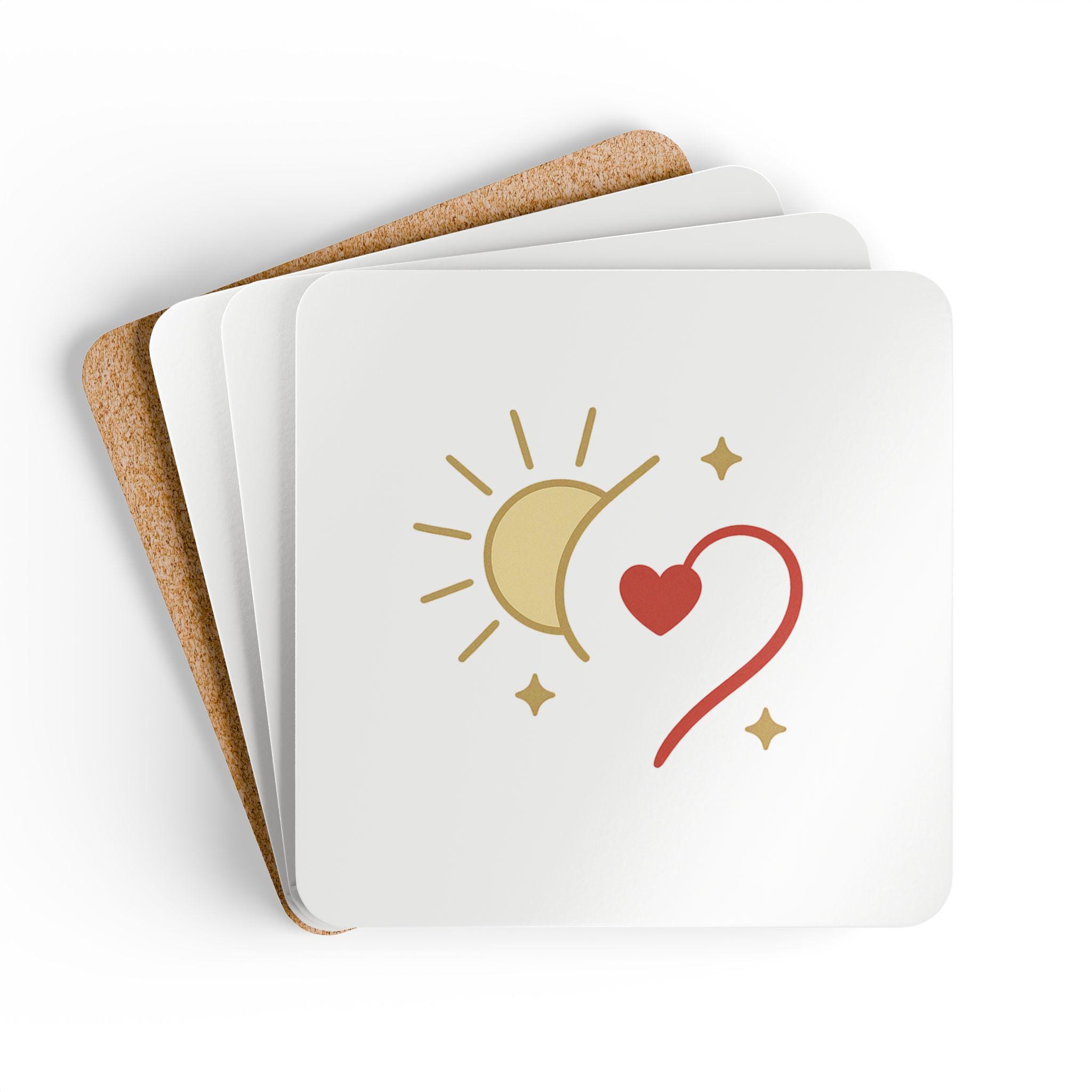 Sun, moon, and a tiny heart—this coaster set brings a quiet, whimsical energy to your tabletop. The glossy white surface makes the gentle golds and warm red pop, while the natural cork underside keeps things steady. These slim, square coasters slip into daily life: morning coffee on the balcony, evening tea during a good book, or a cozy chat with a friend. They add a subtle hand-drawn charm without shouting for attention. For people who collect small, heartfelt touches and curate calm corners, these coasters feel familiar — like a little reminder to slow down and notice the small, lovely moments.