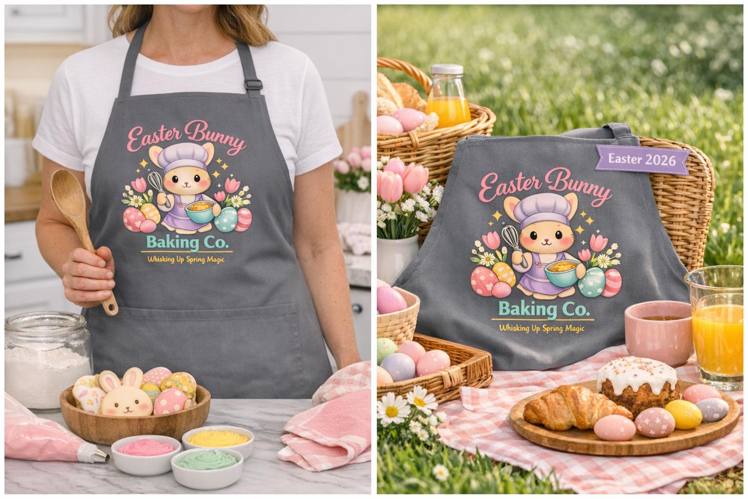 Whisk up spring magic with this adorable “Easter Bunny Baking Co.” apron — the perfect pastel kitchen accessory for bakers, brunch hosts, and bunny lovers alike. Featuring a cute bunny chef holding a whisk and mixing bowl, surrounded by decorated eggs and spring florals, this apron blends festive charm with boutique flair.