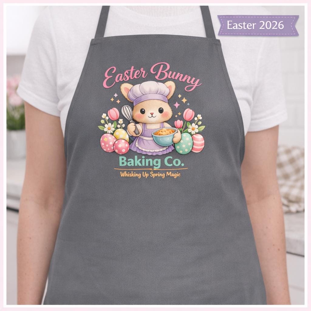 Printed on a soft grey apron, the pastel design pops beautifully — making it ideal for Easter baking, gifting, or adding seasonal joy to your kitchen routine. Whether you're icing cookies, hosting brunch, or wrapping up a sweet spring bundle, this apron brings warmth, whimsy, and a touch of kawaii to every moment.